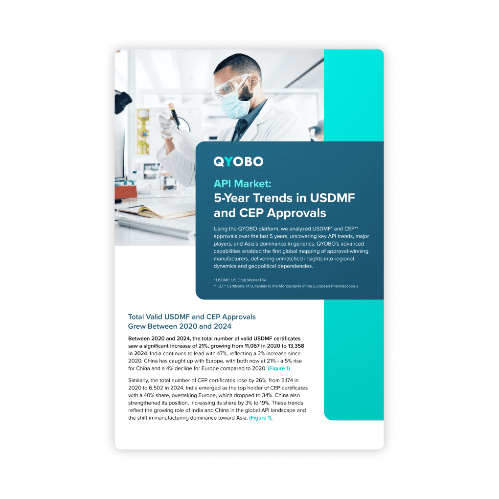 API Market: 5-Year Trends in USDMF and CEP Approvals The API market is evolving rapidly, with regulatory approvals on the rise and manufacturing shifting towards Asia. Over the past five years, USDMF and CEP approvals have grown significantly, reflecting increasing demand for APIs in key therapeutic areas. India and China have emerged as dominant players, reshaping the industry landscape. What do these trends mean for the future of pharmaceutical manufacturing? Explore our latest insights. DOWNLOAD THE WHITEPAPER Fill out the form to get your free download link by email.
