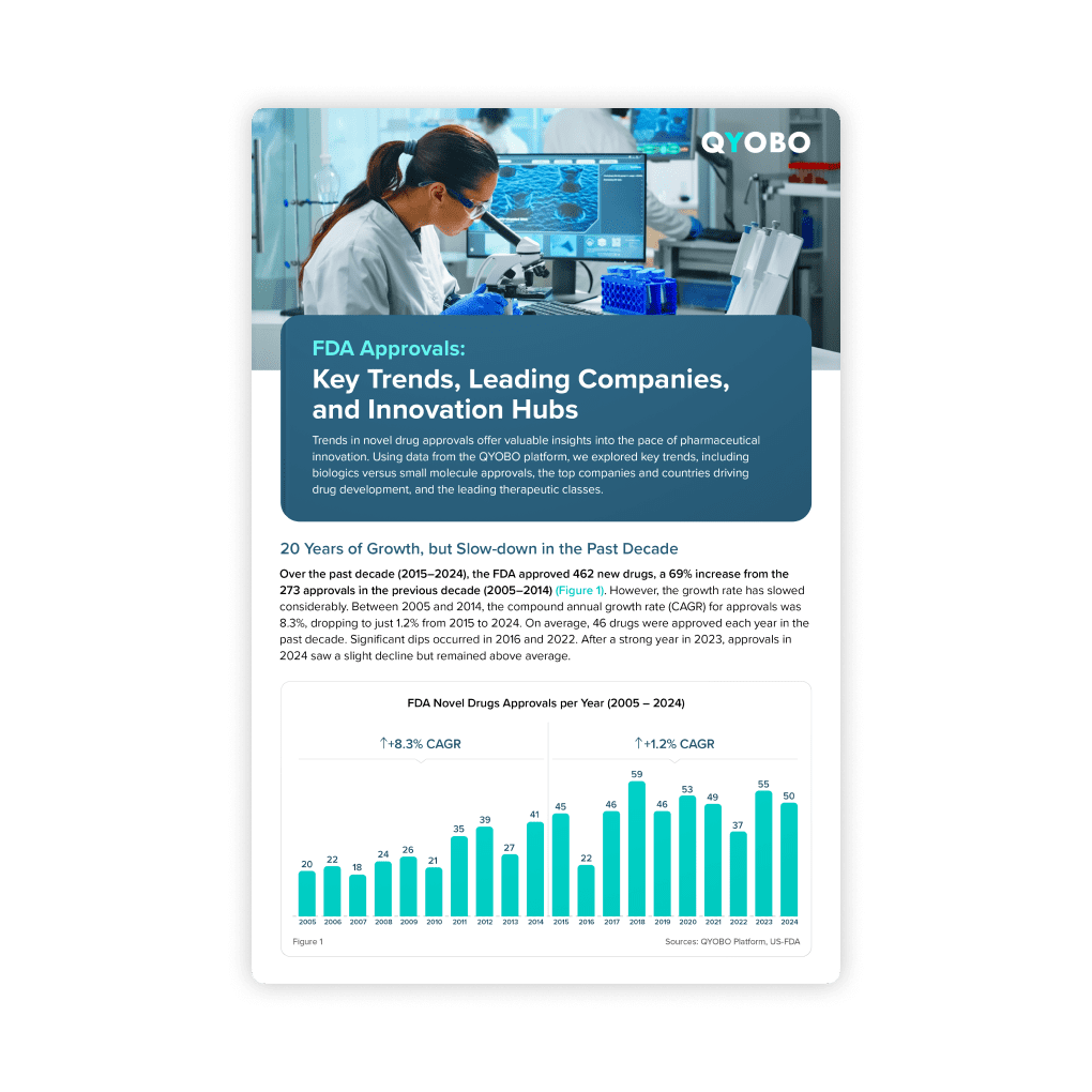 FDA Drug Approvals: Key Trends, Leading Companies and Innovation Hubs FDA drug approvals serve as the pulse of pharmaceutical innovation. Between 2015 and 2024, the FDA approved 462 new drugs – a 69% increase from the previous decade. However, annual growth has slowed, indicating that investments in drug development are outpacing new approvals. DOWNLOAD THE WHITEPAPER Fill out the form to get your free download link by email.