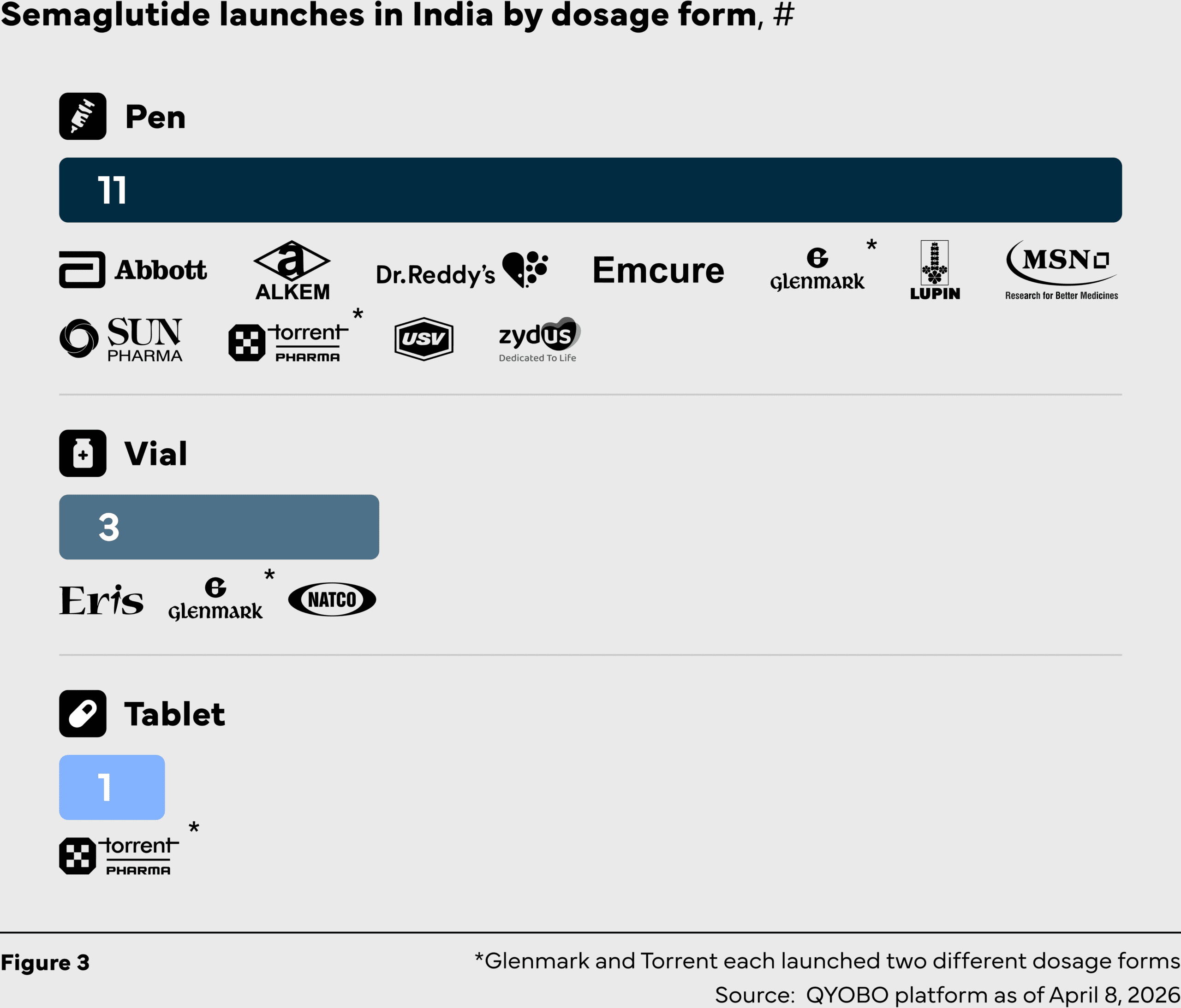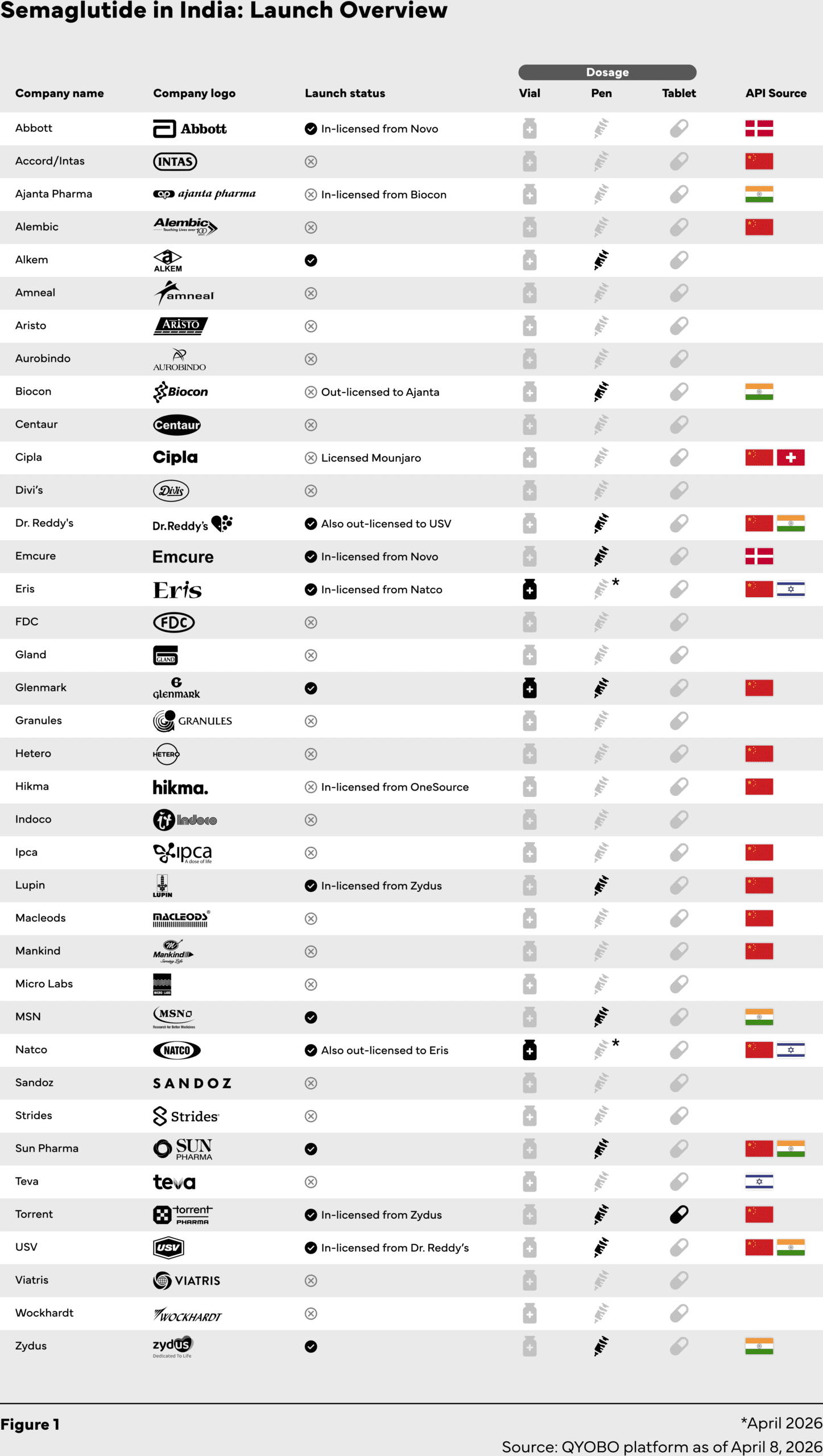 India is the first market where semaglutide generics are entering at scale, providing a benchmark for how competition, pricing, and supply chains evolve once multiple players launch simultaneously. 13 companies have confirmed generic semaglutide launches in India (Figure 1). Including Novo Nordisk as the originator, this results in 14 active players in total: