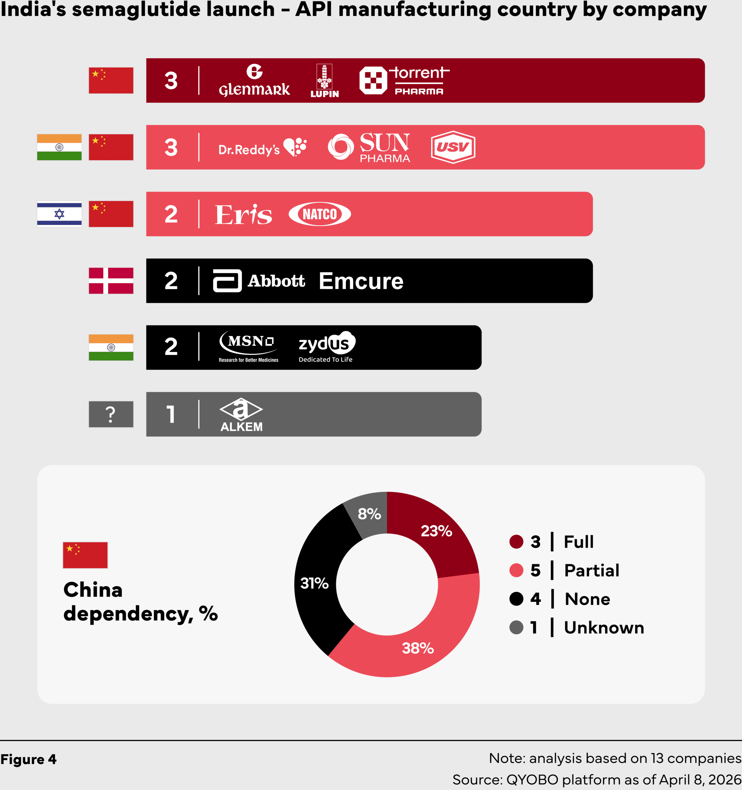 Chinese manufacturers are a critical part of the supply chain behind Indian semaglutide launches – not only at the API level, but also upstream in intermediates and key starting materials (Figure 4):