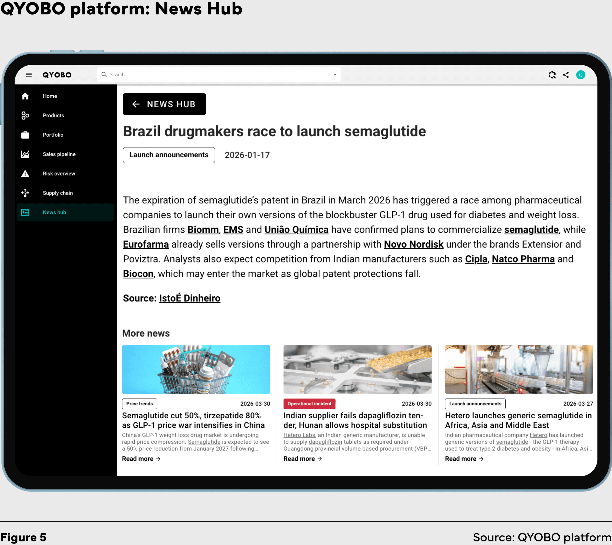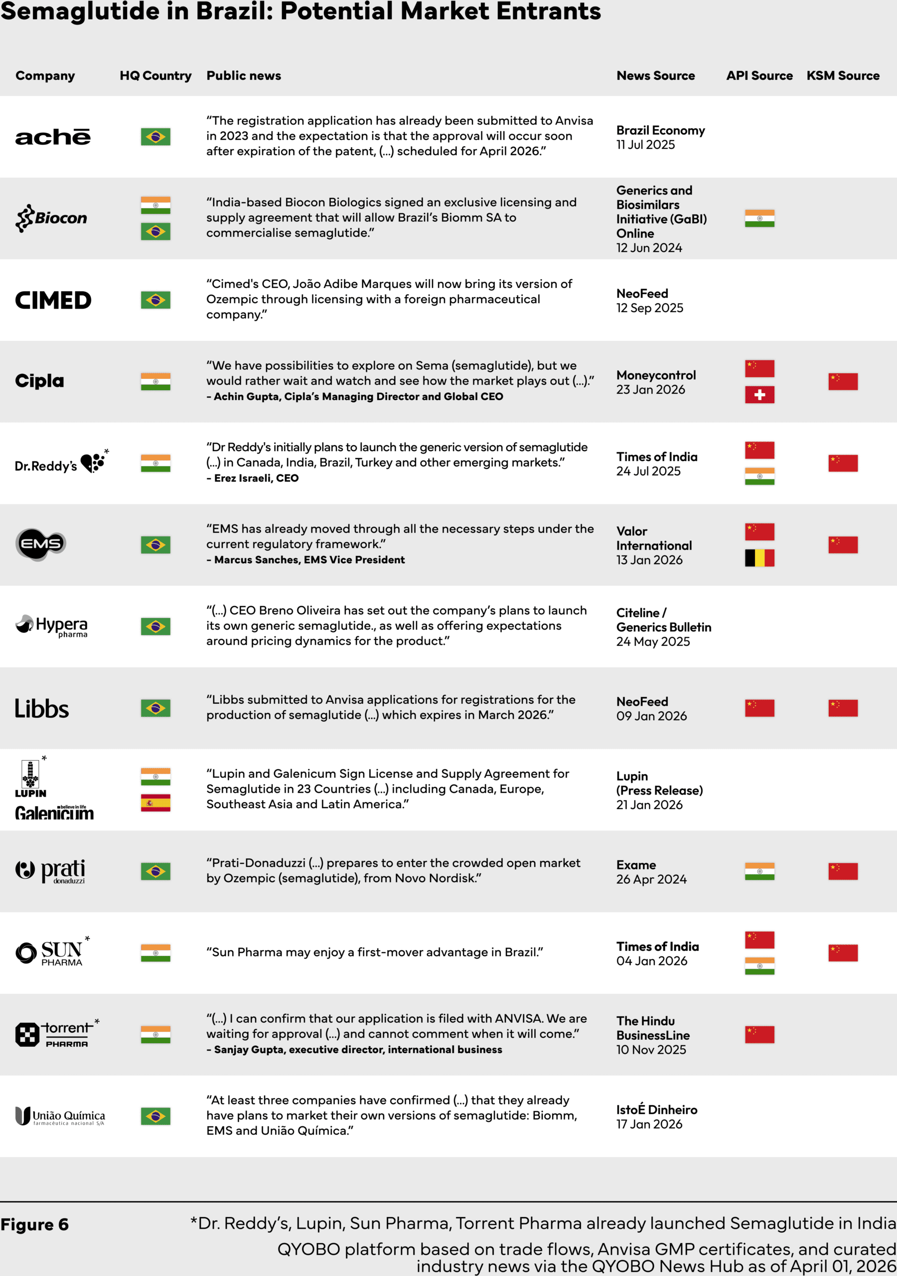Using the QYOBO platform, we have identified 13 companies planning or preparing to launch semaglutide in Brazil, based on trade flows, regulatory data from Anvisa, and public news integrated on the QYOBO News Hub (Figure 5).