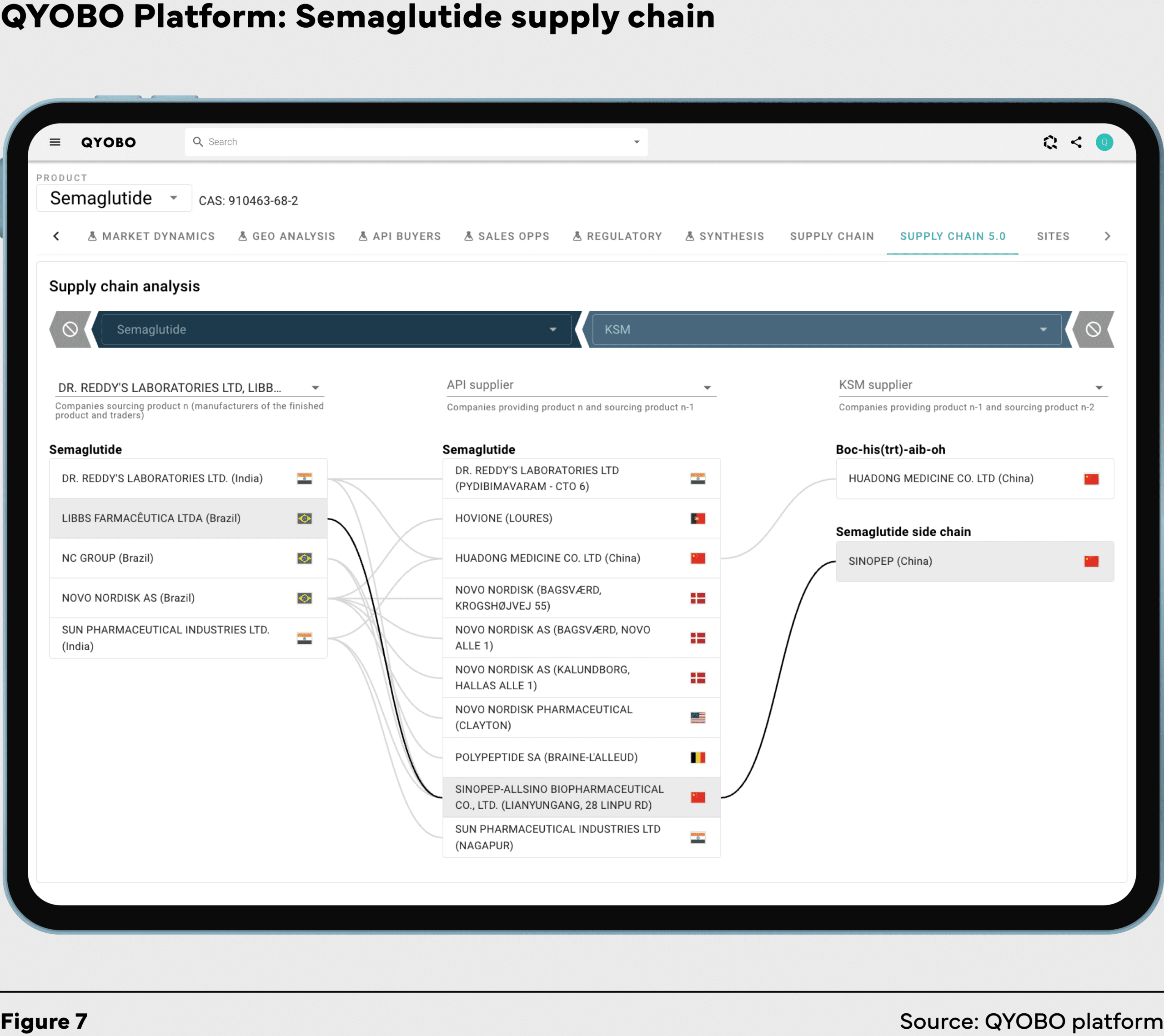 These include both global and local players (Figure 6). Notably, four of these companies are already part of the first launch wave in India: Dr. Reddy’s, Lupin, Sun Pharma, Torrent Pharmaceuticals. The QYOBO platform also provides visibility into supply chains behind these market entries (Figure 6). Here as well, China has the largest footprint in both API and key starting material manufacturing.